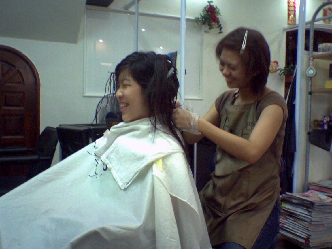 yesterday in e morning, bad thing happen...so was feelin very "xiao qi" so i "du qi" haha. but meet xinhui later in kovan den i temporarily forget about my "qi". oh yah, saw xinyi at kovan and chat happily wif her about our dogs and recent lifes...till i forget to reply xinhui sms. sorry! anyway she become more pretty le! ^-^ then it start to rain! boo!boo! we drench abit but happily go to cut hair. hahaha...xinhui must be lookin forward to get her prefect hair. =p we chat den ya, our taste for pretty gals are diff too. those i find pretty, she say ok. those she find pretty, i find them ok onli. then she also understand how i am feelin! like how i treat toward others and know wad i tinkin! amazing! i hope i can have short term memory too... den hope i not so direct.. *boo* but i cant control when i see someone behaviours that are soo bad or demandin den i tick her off..den somehow, ppl will get offended? anyway, see the hair makin pix...LOL. happily chatting.. her sitting pose..